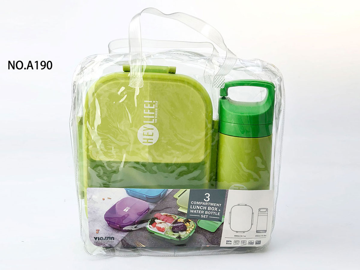 紋彩密封3格飯盒+水壺OPP袋/PVC袋套裝(長方形900+350ml)