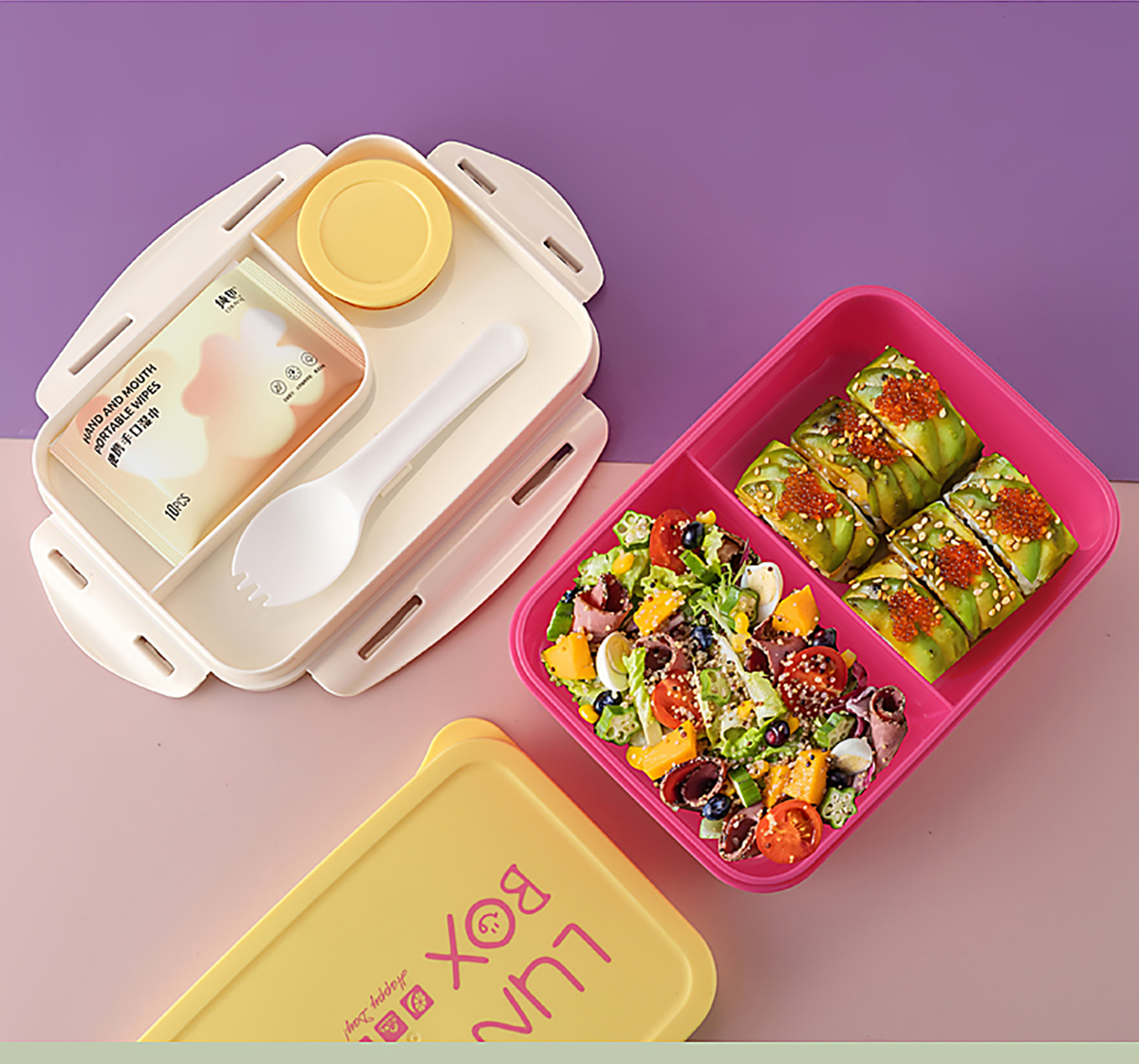 Size: 飯盒:210*150*83mm/1000ml 醬料盒:58*25mm/35ml 叉子:38*42mm