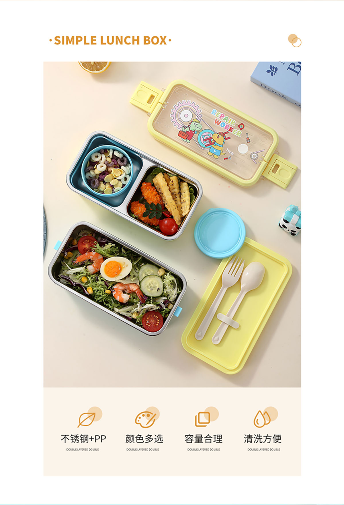 UV 手提單層/雙層卡通不銹鋼餐盒(配PP叉勺+PP湯碗150ml)