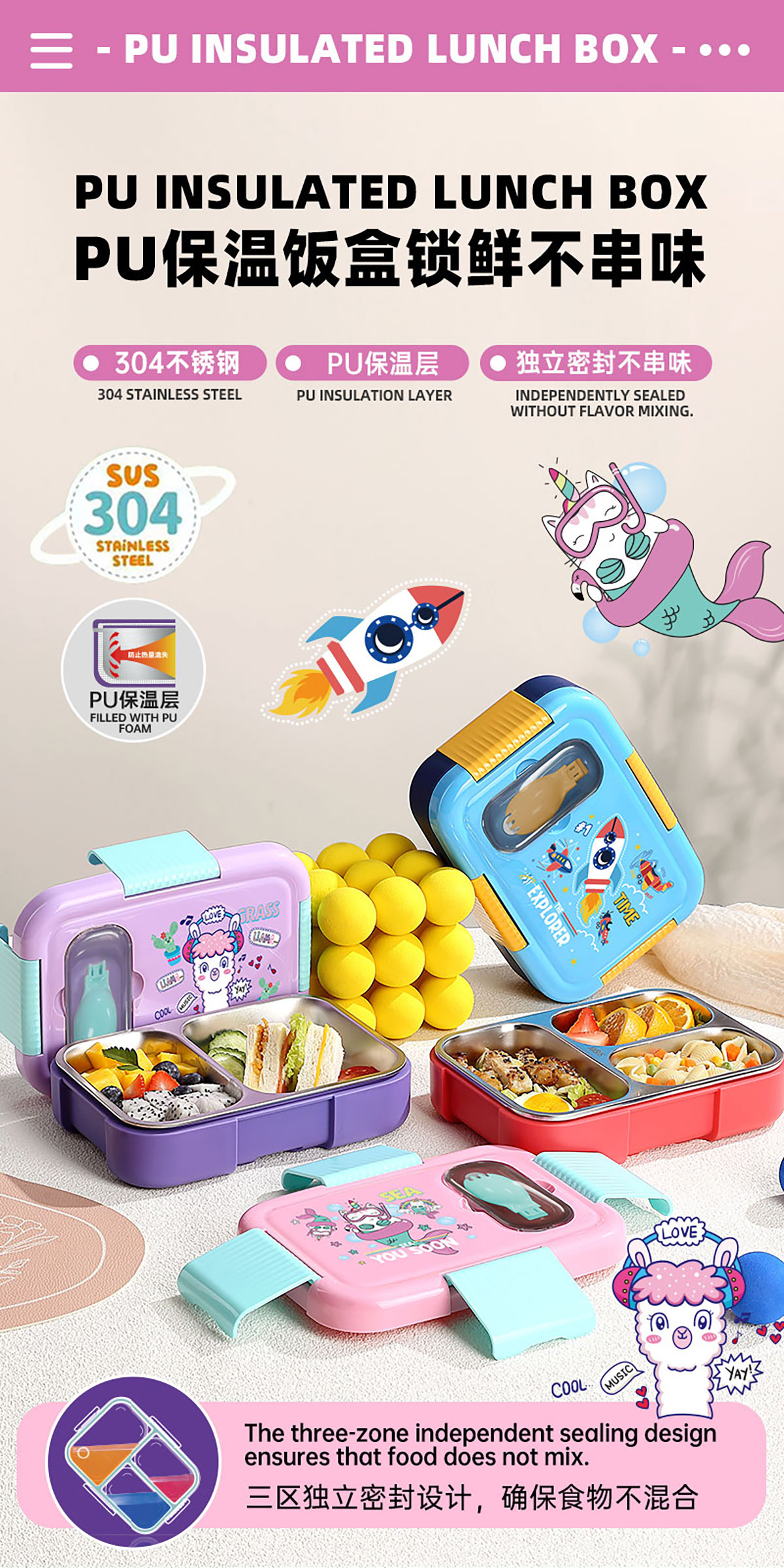 PU全保溫卡通不串味密封餐盒(卡通不銹鋼3格/2格+PP折疊勺)