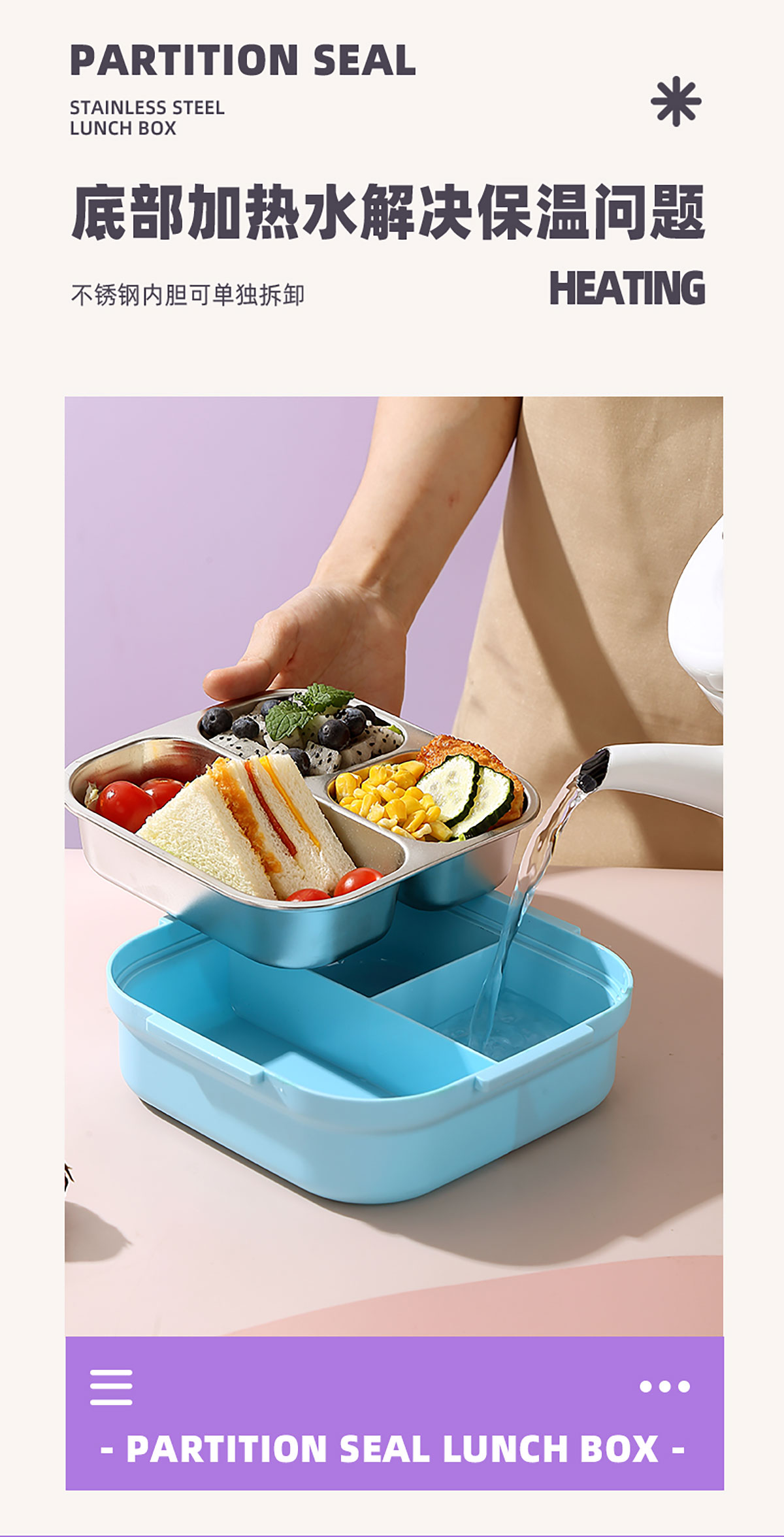 相機(jī)不串味餐盒(方形不銹鋼三格700ml+碗150ml+不銹鋼勺)