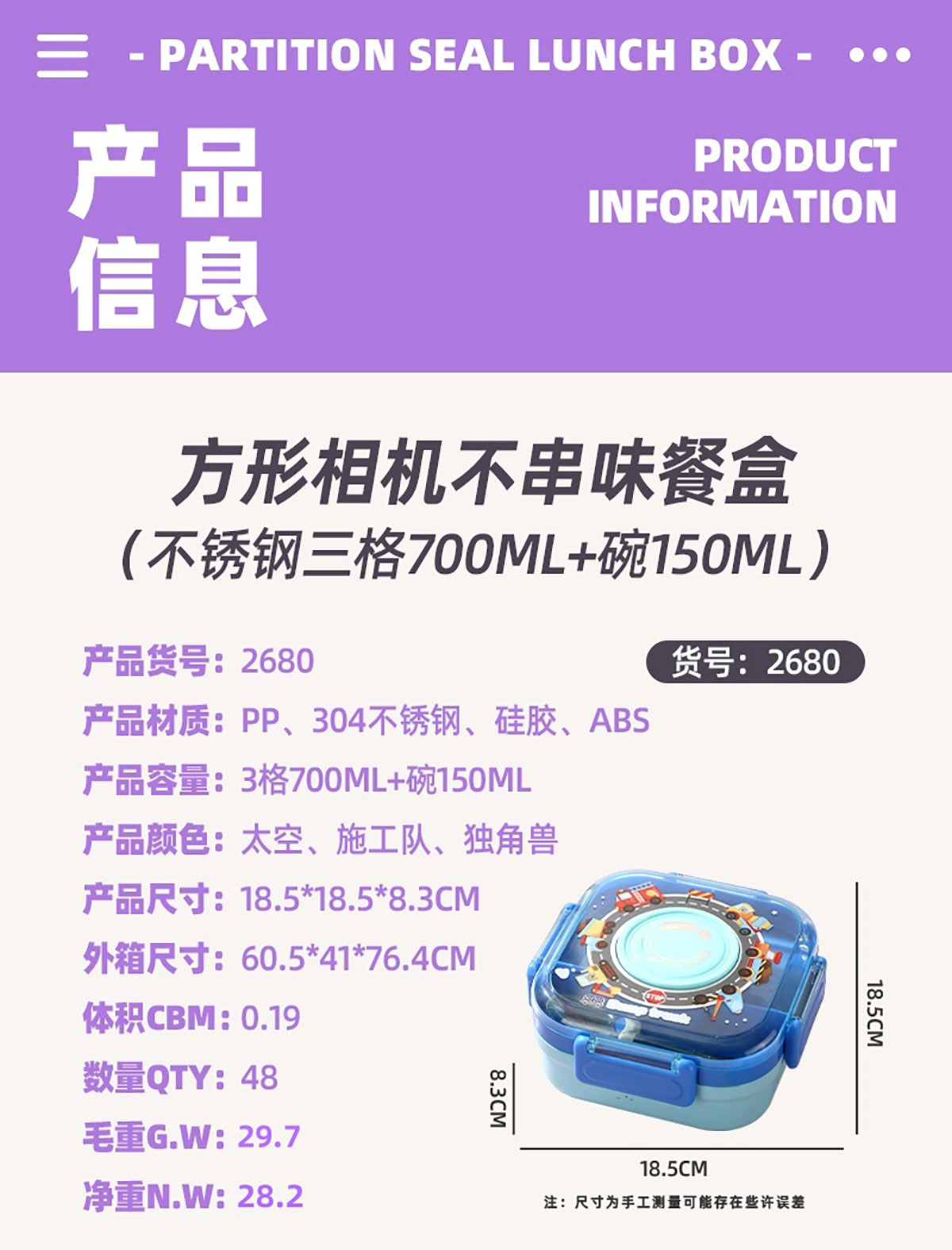 Size: 185*185*83mm/700ml+碗150ml